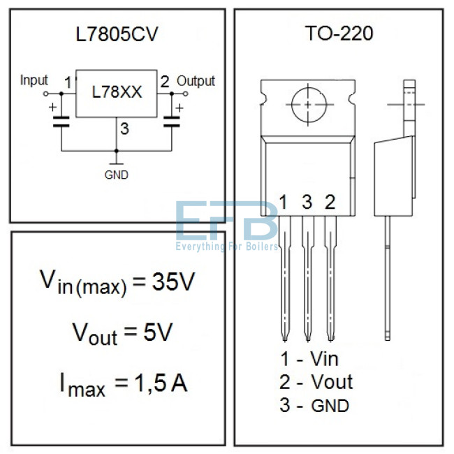 | Аналоги | LM340AT-5.0, UA7805CKCS, MC7805CTG, LM7805CT, КР142ЕН5Б |