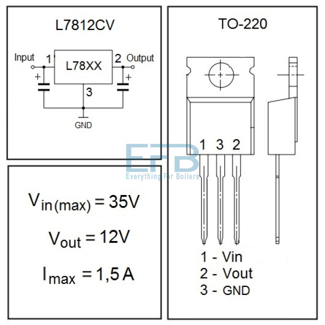 - аналог: KA7812A, LM7812CT, MC7812CT, UA7812CKC, LM340T-12/NOPB, КР142ЕН8Б